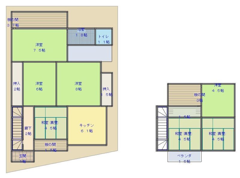 | 建物-面積 | 1階57.02㎡ 2階34.71㎡ | 建物-間取 | 7DK |