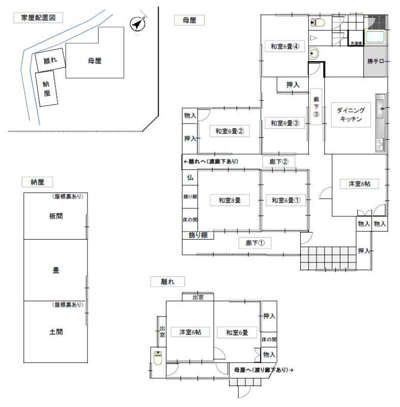 | 建物-面積 | 母屋:155.37㎡ 離れ: 32.49㎡ 納屋 :45.45㎡ | 建物-間取 | |