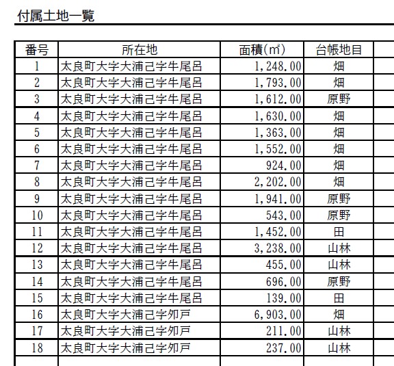| 土地-面積 | 1304.97㎡ 田畑山林原野 28,139 ㎡ | 土地-地目 | |