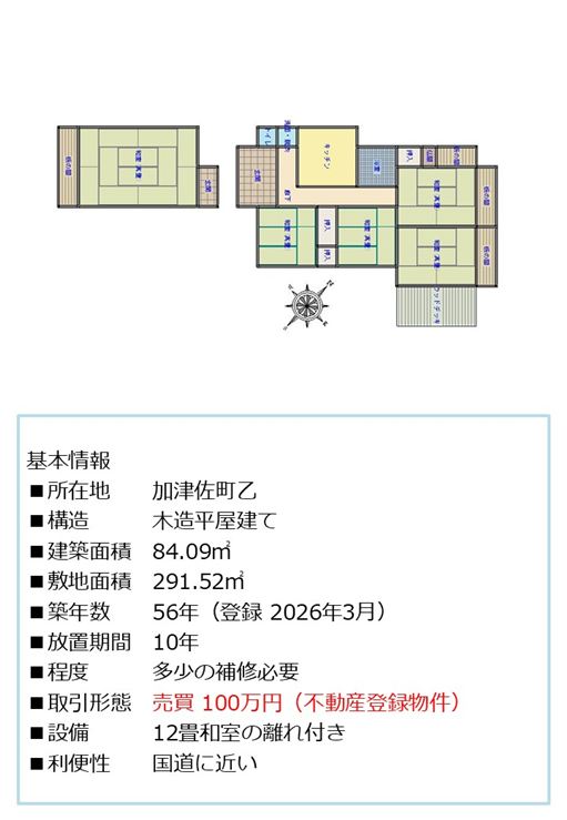 | 建物-面積 | 84.09㎡ | 建物-間取 | 4部屋+離れ12畳 |