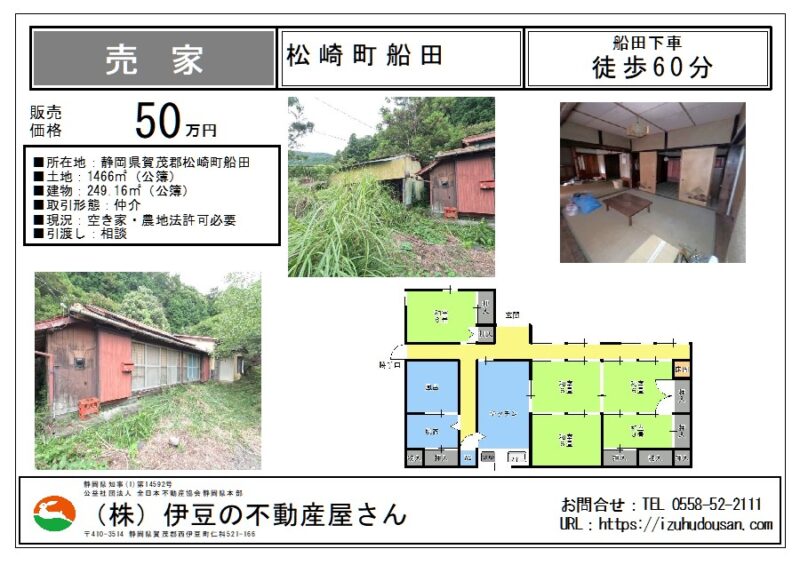 空き家バンク【売買】50万円 静岡県賀茂郡松崎町門野 長閑な山間・広い敷地 駐車場付き7LDK平屋古民家