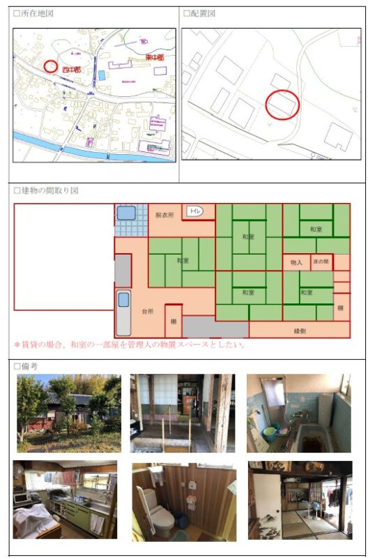 空き家バンク【売買】200万円 鹿児島県鹿屋市獅子目町 長閑な田園地帯・広い敷地 畑・山林・倉庫・駐車場付き4部屋平屋古民家 水洗トイレ 土間・縁側・続き間有 売買価格:200万円 | 賃貸価格: | | 建物-面積:96.09㎡ (約29坪) | 土地-面積:791.64㎡ (約239坪) | 建物-築年月:昭和47年 | 物件番号:空き家バンク物件 341
