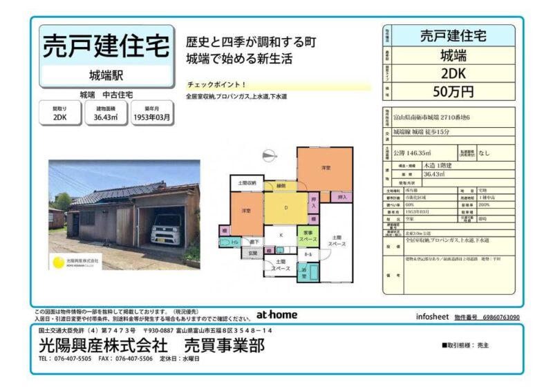 空き家バンク【売買】50万円 富山県南砺市城端 長閑な田園地帯 車庫付き2DKコンパクト平屋古民家 上下水道 土間・縁側有 売買価格:50万円 | 賃貸価格: | 2DK | 建物-面積:36.43㎡ | 土地-面積:146.35㎡ | 建物-築年月:1953年3月 | 物件番号:空き家バンク物件 552