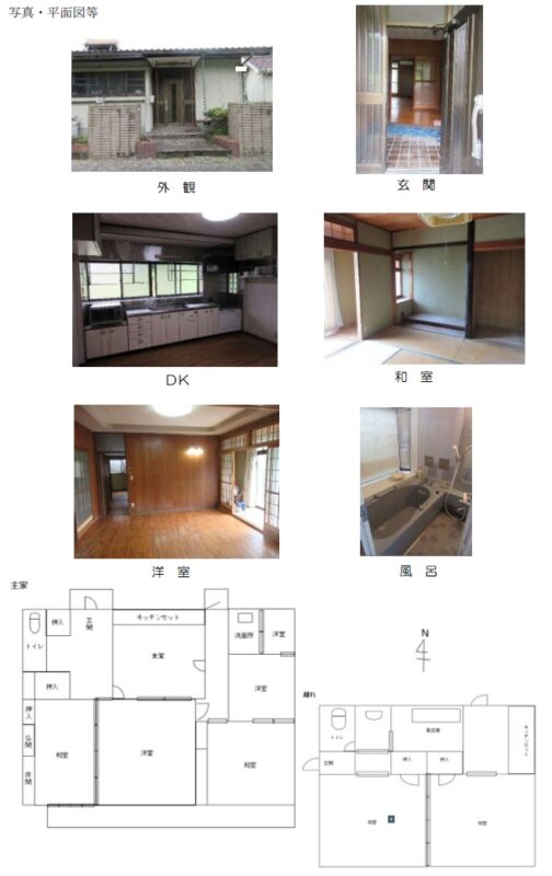 (交渉中)空き家バンク【売買】(現状渡・安価希望)山口県光市大字浅江 倉庫・2DK離れ・駐車場付き4DK鉄骨平屋 水洗トイレ 売買価格:現状のままで安価を希望(贈与税+事務手数料 等) | 賃貸価格: | 母屋4DK 離れ2DK | 建物-面積:113.65㎡ 倉庫(12 ㎡) | 土地-面積:354.72㎡ | 建物-築年月:昭和45 年(離れ 昭和50 年) | 物件番号:空き家バンク物件 53