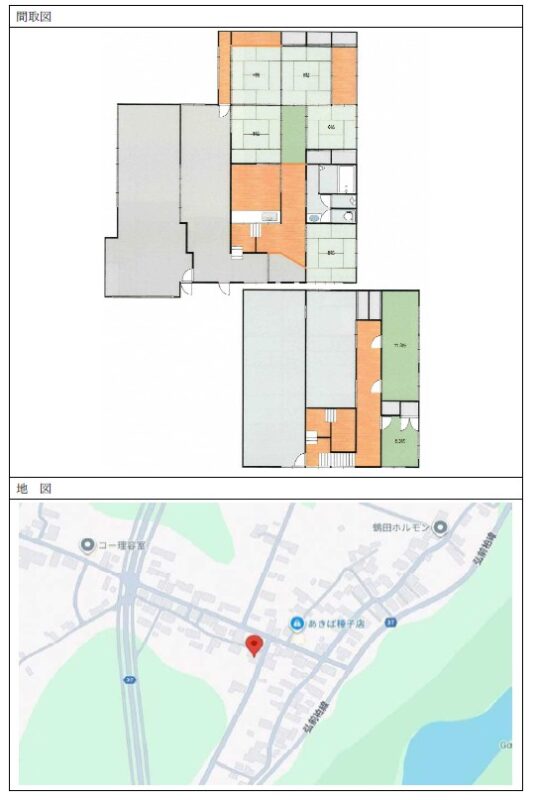 空き家バンク【売買】100万円 青森県つがる市木造平滝宝滝 広い敷地 庭・物置・車庫付き9SDK2階建 玄関二箇所・縁側・続き間有 売買価格:100万円 | 賃貸価格: | 9SDK | 建物-面積:1階213.64㎡ 2階17.10㎡ | 土地-面積:2,320㎡ | 建物-築年月:昭和28年 | 物件番号: