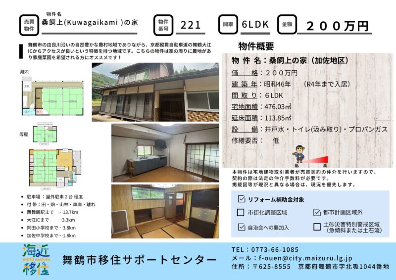 空き家バンク【売買】200万円 京都府舞鶴市桑飼上 自然豊かな場所 田畑・山林・離れ・車庫付き6LDK2階建古民家 井戸・土間・縁側・続き間有 売買価格:200万円 | 賃貸価格: | 6LDK | 建物-面積:113.85㎡ | 土地-面積:476.03㎡ | 建物-築年月:昭和46年 | 物件番号:空き家バンク物件 221
