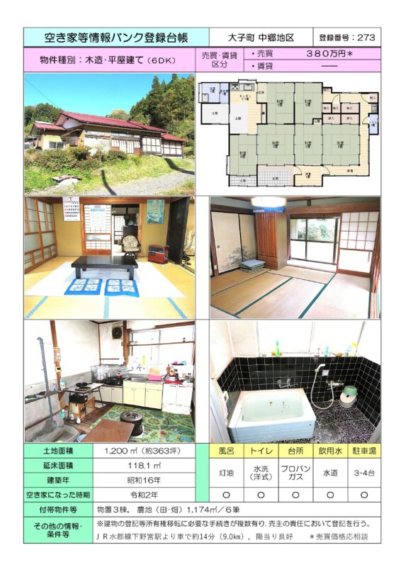 空き家バンク【売買】380万円(応相談)茨城県久慈郡大子町中郷 広い敷地・日当り良好 田畑・物置3棟・駐車場3~4台付き6DK平屋古民家 水洗トイレ 土間・回り縁・続き間有 売買価格:380万円(応相談) | 賃貸価格: | 6DK | 建物-面積:118.1㎡ | 土地-面積:1200㎡ 田畑1174㎡ | 建物-築年月:昭和16年 | 物件番号:空き家バンク物件 273